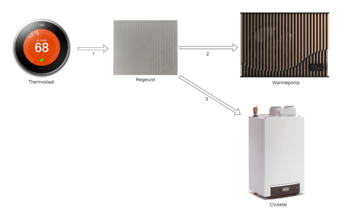 Deze warmtevraag komt binnen op de Control Unit, het brein van je verwarmingssysteem. Deze zal via allerlei berekeningen en instellingen bepalen of de warmtepomp (2), de cv-ketel (3), of allebei de systemen moeten bijdragen aan het verwarmen. Kort gezegd kijkt de Control Unit naar het volgende: